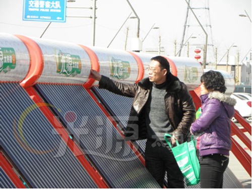 陽光明媚下的晉中是那么引人注目,60多臺(tái)光源太陽能在逸園大酒店廣場展現(xiàn)光源氣勢(shì),引來了四面八方的新老客戶,現(xiàn)場新老朋友對(duì)光源產(chǎn)品質(zhì)量表示了肯定,青花瓷的水箱,紫金波紋集熱真空管,讓新老朋友贊不絕口。