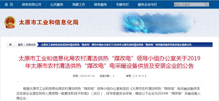 根據太原市工業(yè)和信息化局農村清潔供熱“煤改電”領導小組辦公室制定的《太原市農村清潔供熱“煤改電”電采暖設備供貨及安裝企業(yè)潛在投標入圍資格一般要求和技術標準》(試行),經專家委員會評審,確定河北光源太陽能科技有限公司為2019年山西太原市“煤改電”采暖設備入圍企業(yè)。入圍產品為:蓄熱式電鍋爐、蓄熱式電暖器。