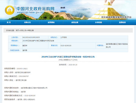 喜報(bào)頻傳,河北光源太陽能科技有限公司,在2019年09月16日,2019年王官莊鎮(zhèn)氣代煤工程壁掛爐采購及安裝項(xiàng)目的競(jìng)標(biāo)中,憑借過硬的產(chǎn)品質(zhì)量,扎實(shí)高效的工作作風(fēng),卓越的運(yùn)作團(tuán)隊(duì)和良好的企業(yè)信譽(yù),以絕對(duì)的優(yōu)勢(shì)順利中標(biāo)。