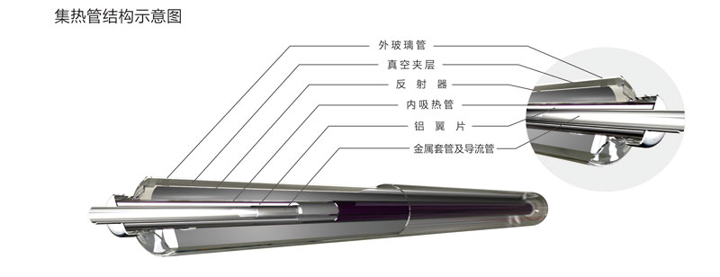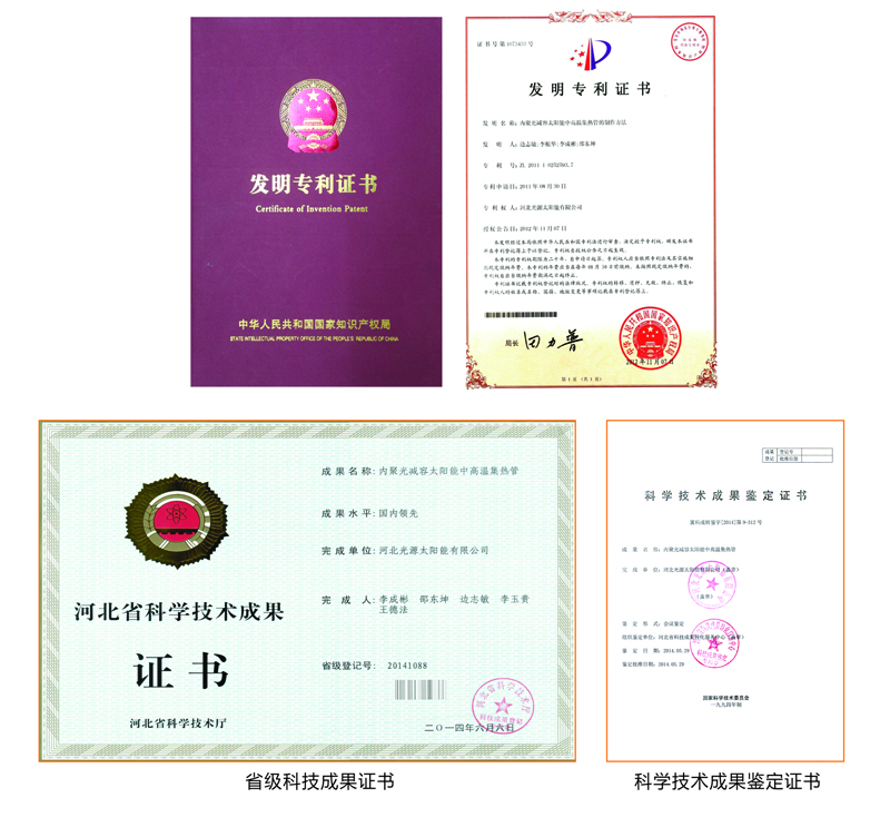 技術(shù)特點:一是內(nèi)置CPC反射器。外罩玻璃管與吸熱管采用同軸套管,在真空管內(nèi)壁下半周設(shè)置金屬拋物面反射器,運用拋物面原理實現(xiàn)了全角度采光,反射器不受大氣污染,聚光效果更好。二是耐高溫鍍膜技術(shù)。內(nèi)吸熱管表面濺射耐高溫太陽吸收膜層,內(nèi)外管之間抽真空,工作溫度400℃以上膜層不脫落、不老化。三是強制傳質(zhì)傳熱技術(shù)。在吸熱管內(nèi)插裝金屬套管,套管內(nèi)置入金屬導(dǎo)熱管,使管內(nèi)的介質(zhì)容量減少了70%,大大提高了傳質(zhì)傳熱效率。四是安全承壓技術(shù)。金屬套管與聯(lián)集箱采用絲扣連接,保證系統(tǒng)工作安全可靠。經(jīng)權(quán)威機構(gòu)檢驗,太陽能吸收比、熱損系數(shù)、真空品質(zhì)等技術(shù)指標均優(yōu)于國家標準。采用該產(chǎn)品組成的太陽能中高溫熱利用系統(tǒng),穩(wěn)定工作溫度可達到163℃蒸汽,真正實現(xiàn)了太陽能由“熱水應(yīng)用”到“熱能應(yīng)用”的跨越式提升,填補了國內(nèi)太陽能中高溫真空集熱管在160℃溫區(qū)的技術(shù)空白。科技成果鑒定認為:該產(chǎn)品的綜合性能達到了“國內(nèi)領(lǐng)先水平”,系統(tǒng)可廣泛用于太陽能飲用開水、采暖制冷、食品加工、紡織印染、農(nóng)副產(chǎn)品烘干等多種行業(yè)。對促進大氣污染治理,推動我國能源結(jié)構(gòu)調(diào)整具有重要意義。