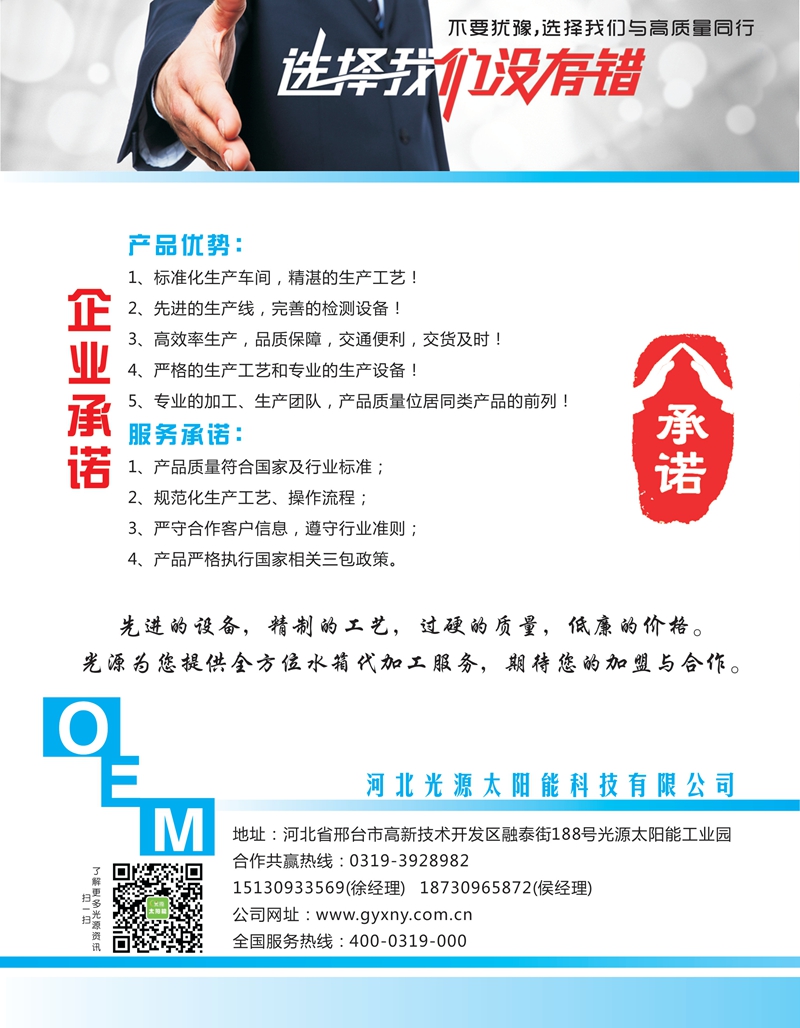 河北光源太陽能科技有限公司是一家集太陽能光熱產(chǎn)品研發(fā)、生產(chǎn)、銷售為一體的專業(yè)化骨干企業(yè)。公司地址位于河北省邢臺經(jīng)濟(jì)開發(fā)區(qū),總占地150畝,建筑面積5.2萬平方米,現(xiàn)有員工420人。主導(dǎo)產(chǎn)品:一是太陽能真空集熱管;二是家用型太陽能熱水器;三是集中式中高溫太陽能工程的設(shè)計、生產(chǎn)與施工。企業(yè)規(guī)模為河北省太陽能熱利用行業(yè)榜首,國內(nèi)業(yè)界名列前茅。